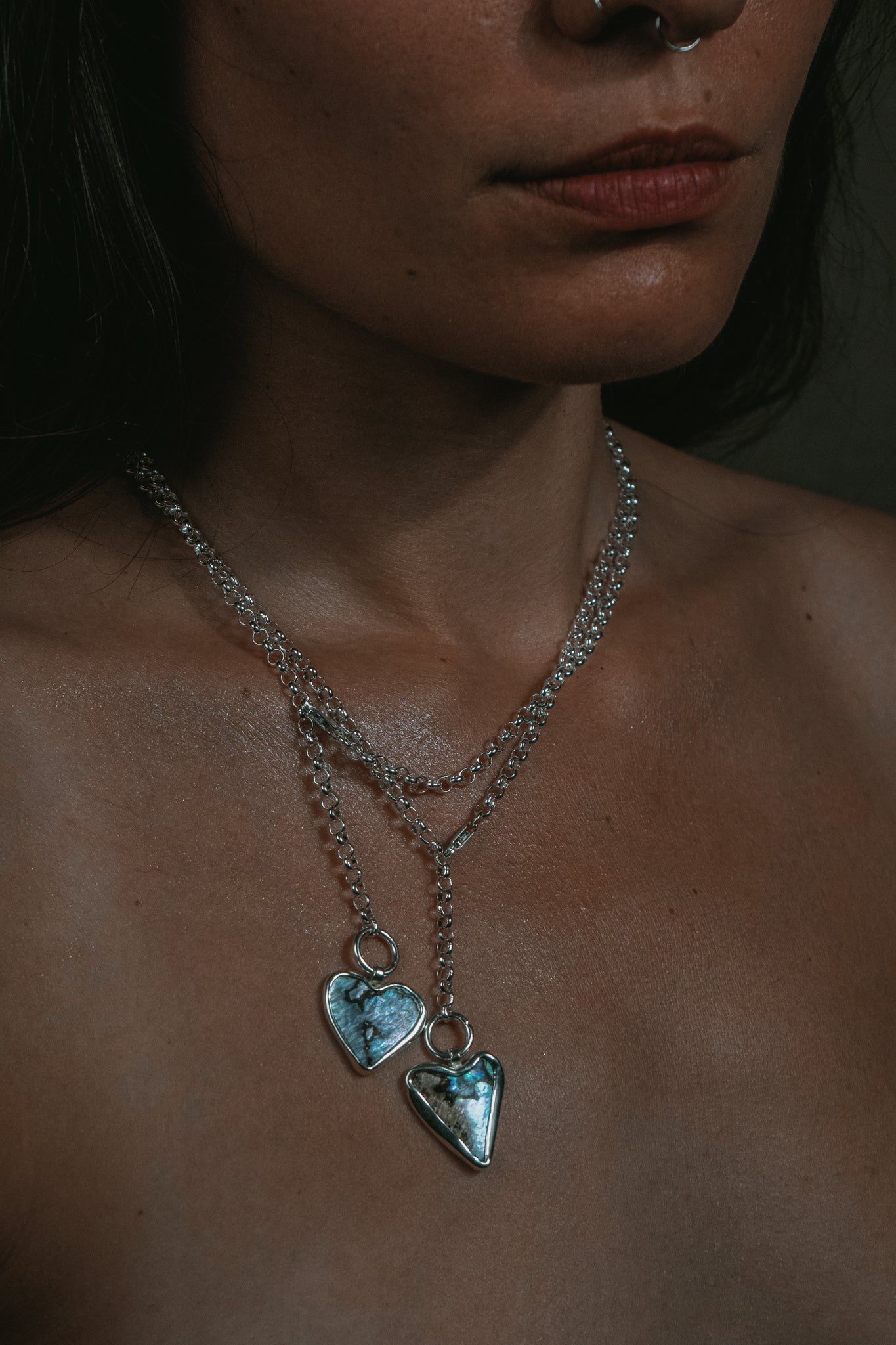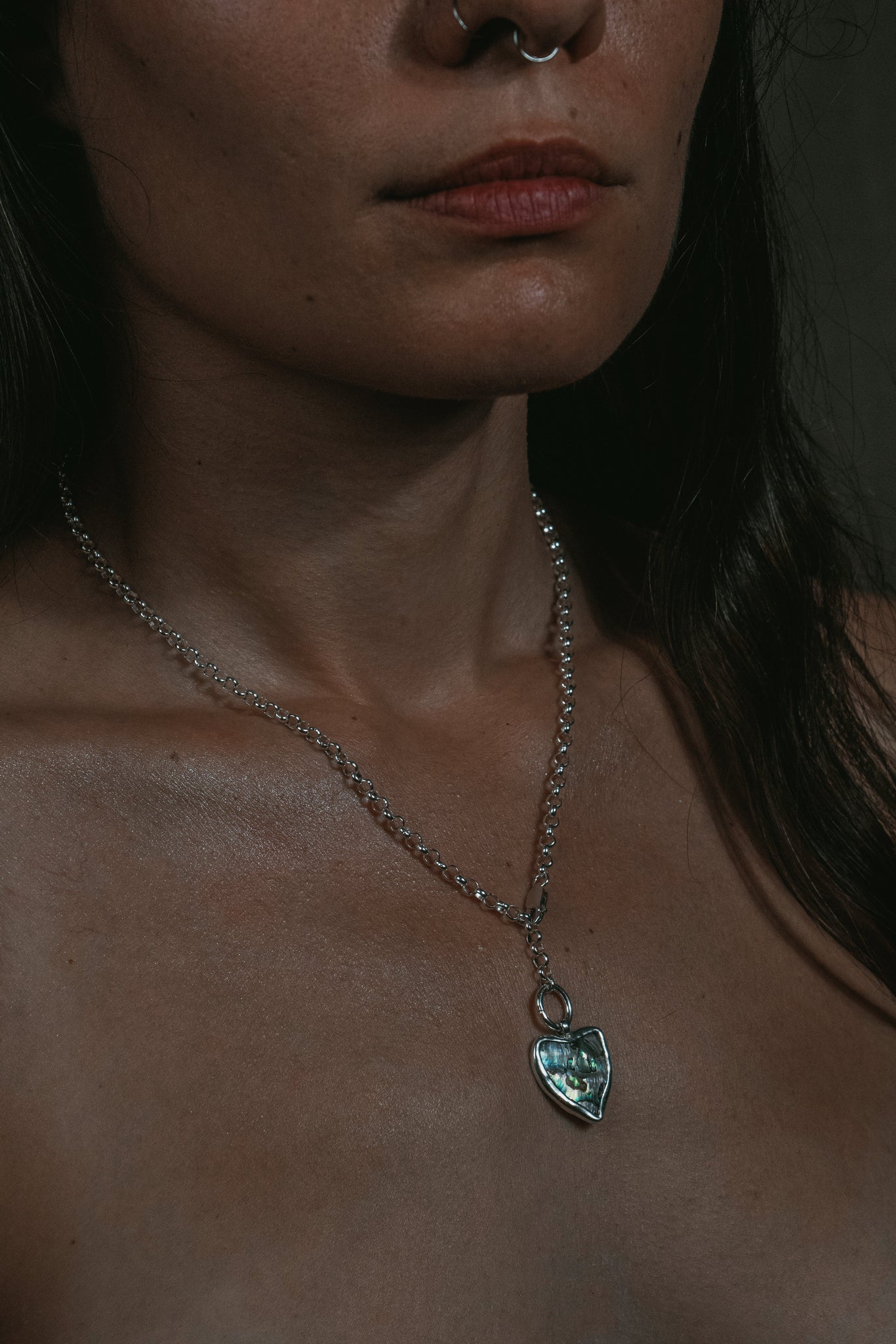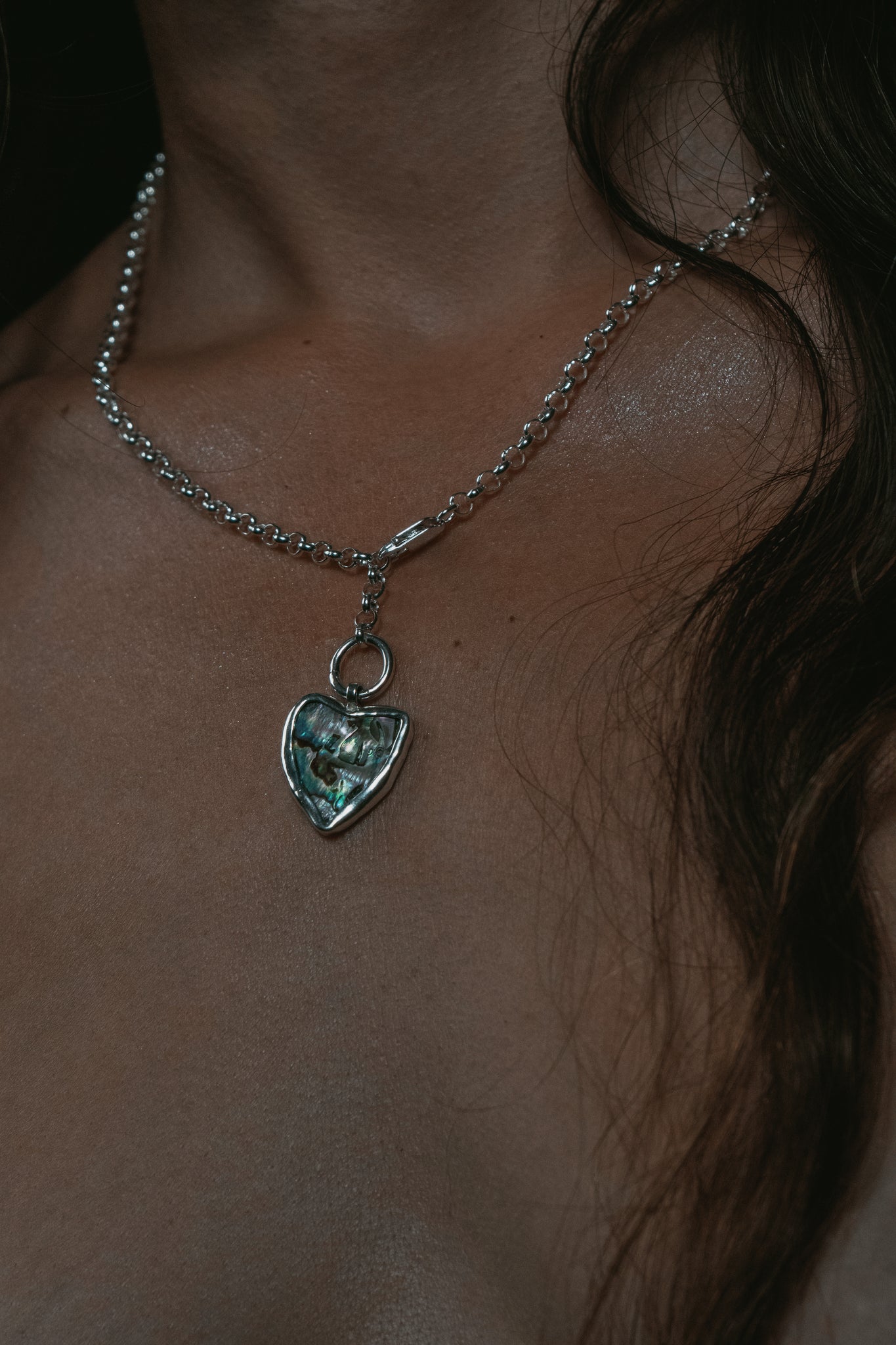 AMAS is a necklace crafted with .925 silver, featuring a heart-shaped Abalone (Pāua) shell attached to one end of a .925 silver round link chain.